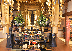 福成寺は堺の釈迦堂と言われる通り、釈迦如来像を本尊として本堂の厨子内に安置しています。この御釈迦様の尊像は清凉寺式釈迦如来立像と呼ばれるものです。なぜ清涼寺式と付くのかと申しますと、福成寺の釈迦像は京都嵯峨にある清涼寺の釈迦像に由来があるからです。